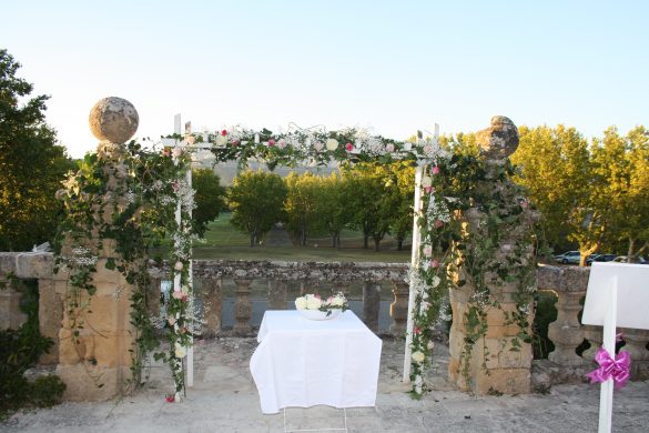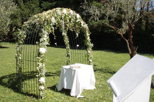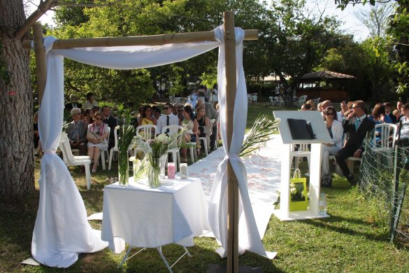 Ce lieu sacré est souvent aussi représenté par l’arche décorée. Très visuellement associée aux cérémonies « à l’américaine », l’arche décorée, fleurie, sert de décor à la cérémonie. Parfois, on s’en sert en début d’allée, comme d’une porte que les époux franchissent vers leur avenir commun. Elle peut être également une interprétation de la houppa juive. En effet, les mariages juifs ont toujours lieu sous une houppa, composée d’un voile tendu sur quatre poteaux, comme une représentation de la tente d’Abraham. Ouverte sur les côtés en signe d’hospitalité envers tous, elle représente le foyer des époux.