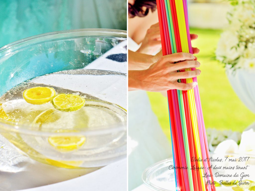 Il faut donc bien préparer en amont le choix de ses ingrédients et leur trouver une correspondance avec vous, vos personnalités, votre couple afin que votre officiant puisse expliquer le sens de ce rituel (non, ce n’est pas juste pour commencer le vin d’honneur en avance…!). Par exemple : le rhum pour la force, la vanille pour la sensualité, le citron pour le peps, la limonade pour le pétillant…